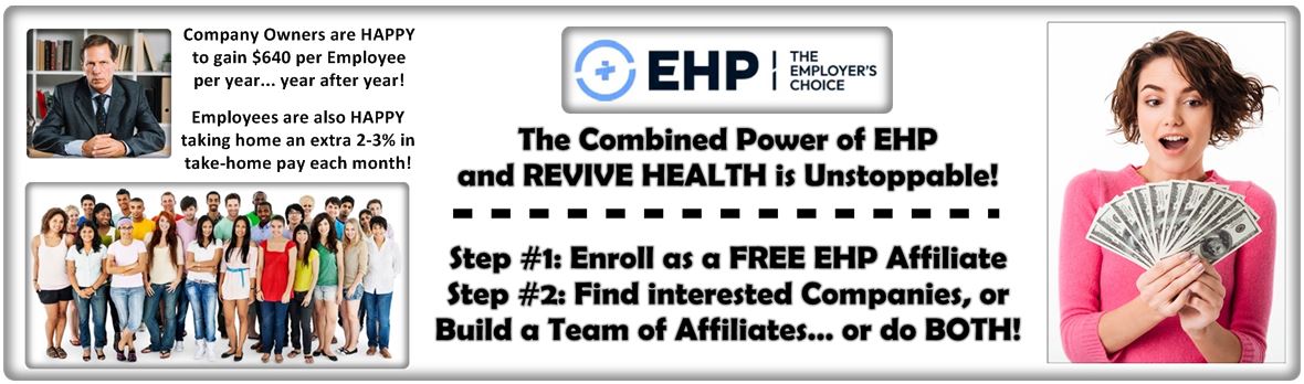Remember, this is not a start-up company of which 95% are statistically proven to be out of business in their first year! EHP is the exclusive marketing arm for Revive Health! They have been providing industry leading supplemental healthcare to companies for almost 4 years now. Between them, EHP and Revive Health have become an unstoppable force doing hundreds of millions per month in business revenue.
